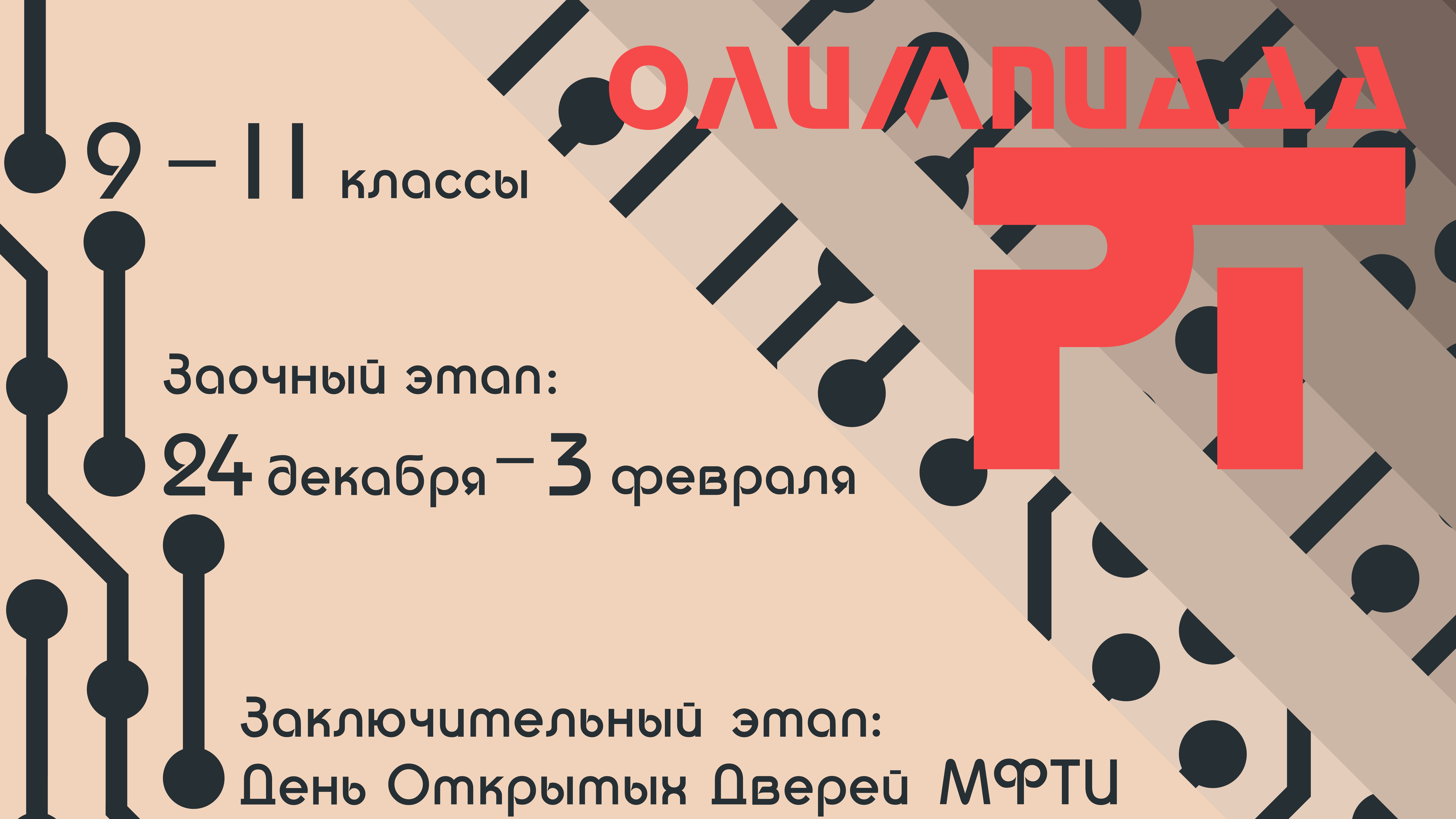 Физтех-Школа Радиотехники и Компьютерных Технологий приглашает учеников 9-11 класса принять участие в РТ-олимпиаде 2021-2022! С 24 декабря по 3 февраля пройдет первый отборочный этап олимпиады в онлайн-формате.